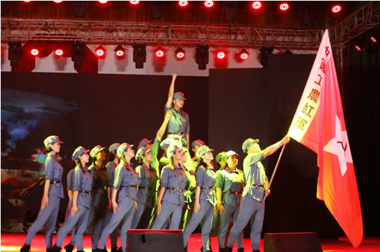 文藝演出結(jié)束,全場起立,共同高唱《沒有共產(chǎn)黨就沒有新中國》,熱烈掌聲經(jīng)久不息。